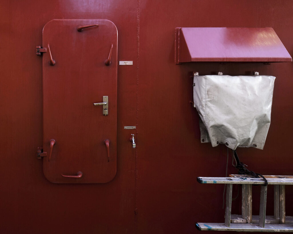 » Echelle, escale. Dans la Marine, jusqu’au milieu du XIXe siècle, les deux termes étaient synonymes. Pour avoir la même racine : scala en italien. On pouvait désigner des ports méditerranéens comme des échelles du Levant. Maintenant, on dit seulement escale. Une escale est un lieu où l’on pousse une échelle. » Richard Baron, photographe, monte à bord par l’échelle de coupée, rencontre les marins de passage, approche leurs regards, leurs attitudes.
